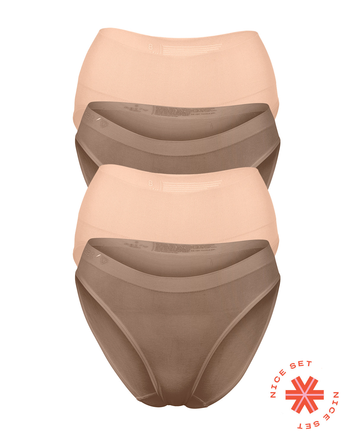 Four-pack wireless bras in gray, mustard, navy, and beige, soft and breathable for all-day comfort, best wireless bra bundle
